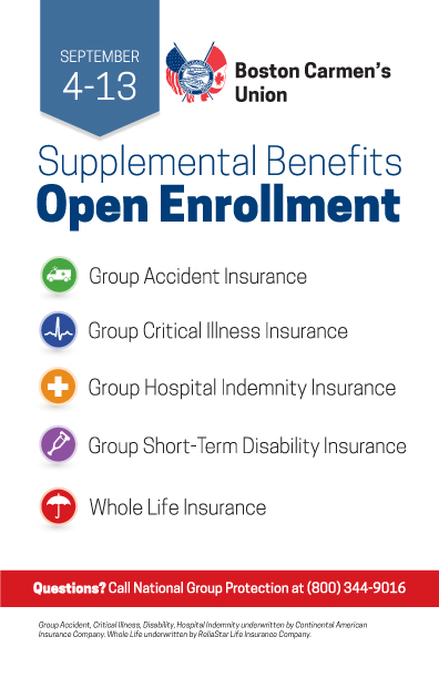 Boston Carmen’s Union members will have the opportunity to participate in the union-sponsored supplemental benefits program September 4 – 13, 2019. Local 589 members will have access to the following supplemental benefits: Accident Insurance – pays for injuries & treatments resulting from an accident Critical Illness Insurance – pays a lump sum benefit if you suffer from a critical…
