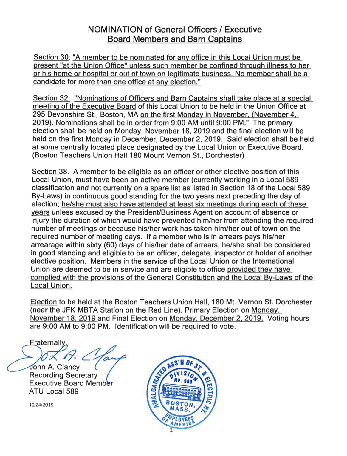Dear 589 Family, We understand election time can be confusing with so many people campaigning. That is why we wanted to provide you with information about the upcoming elections, including who you can vote for as well as when and where you can vote. Important Dates: Nominations: Monday, November 4, 2019, from 9am till 9pm at the Boston Carmen’s…