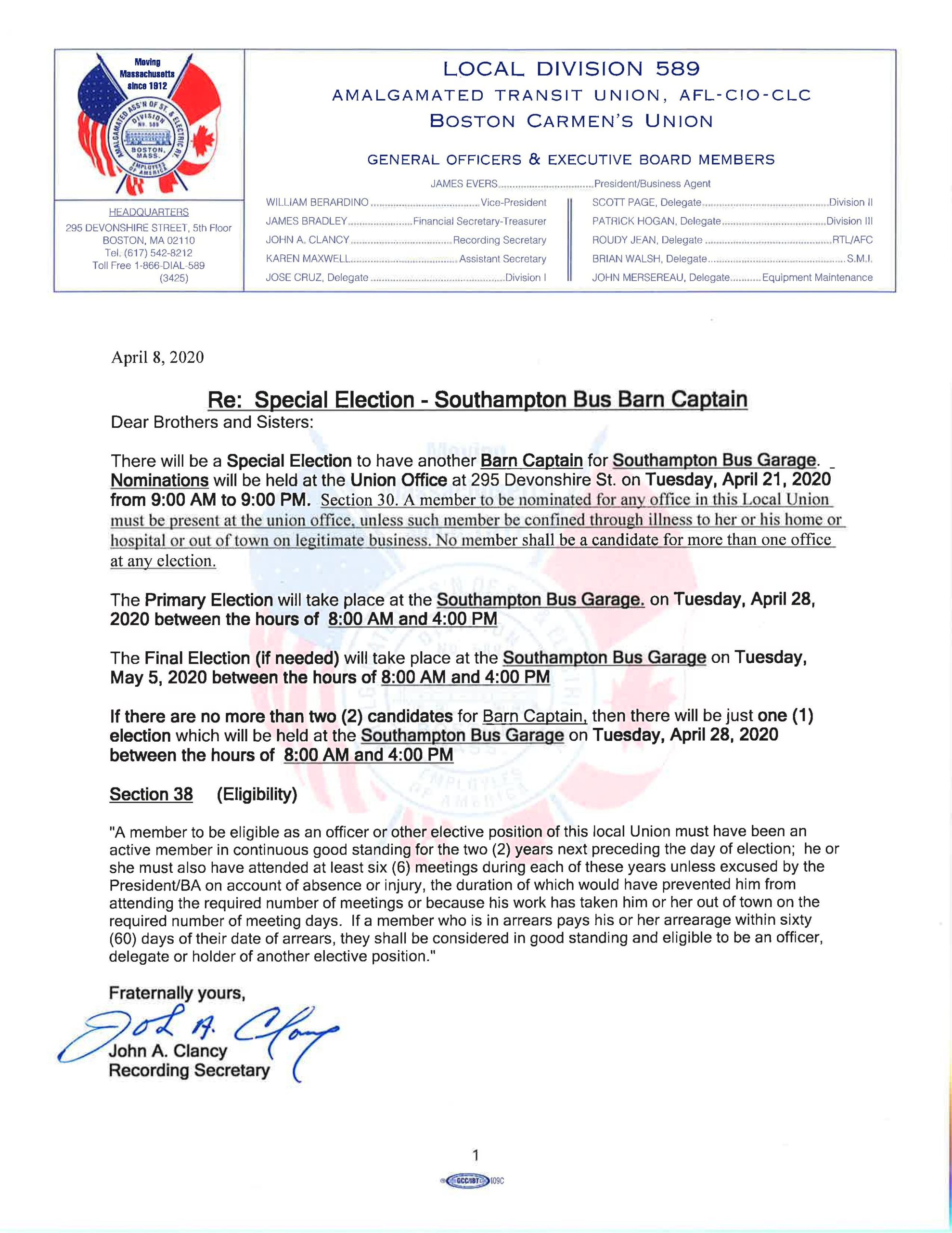 This special election will be held at the union office at 295 Devonshire Street on Tuesday, April 21, 2020, from 9 a.m. to 9 p.m. If you have any questions, please contact your delegate or a member of the e-board.