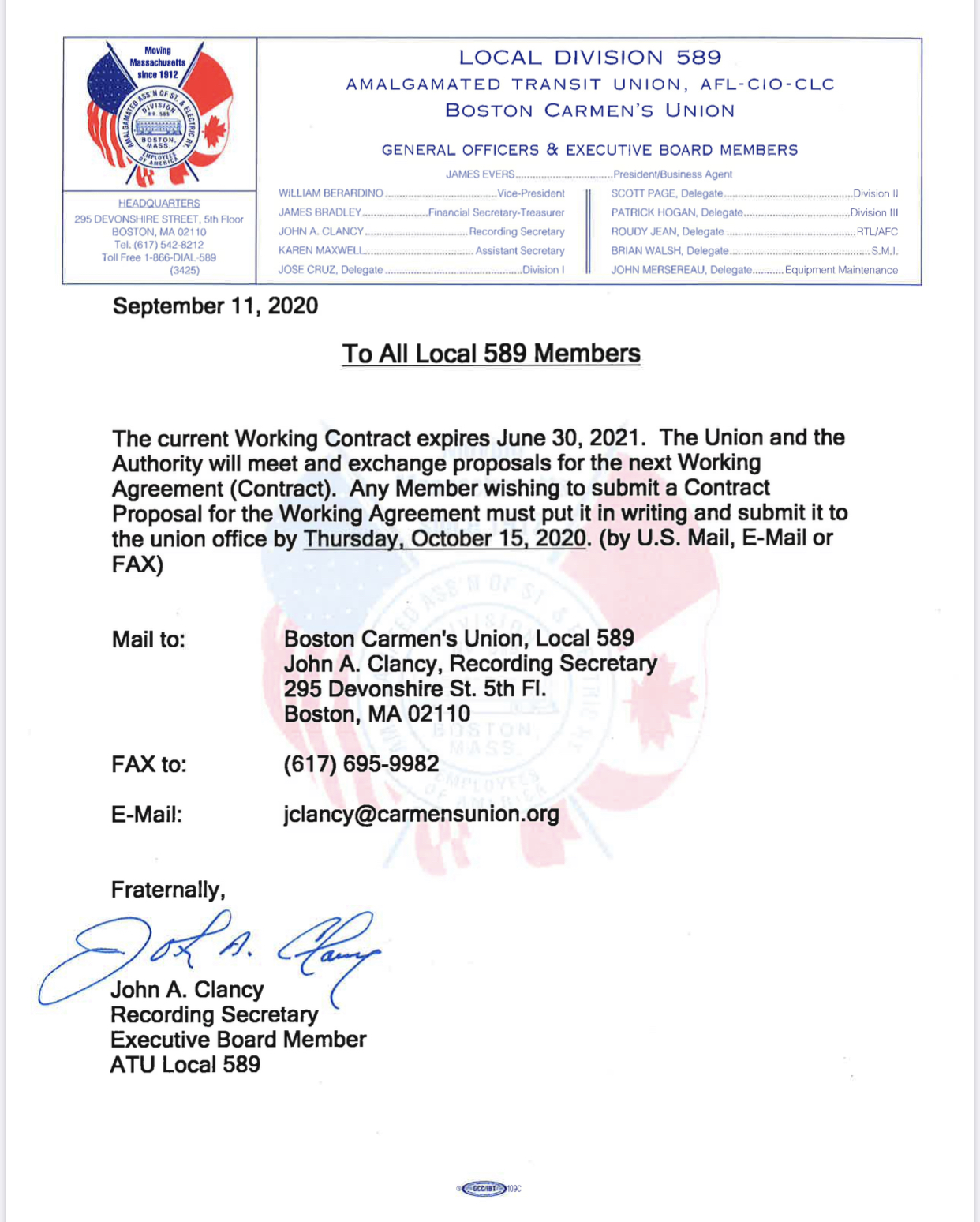 To All Local 589 Members The current Working Contract expires June 30, 2010. The Union and the Authority will meet and exchange proposals for the next Working Agreement (Contract). Any Member wishing to submit a Contract Proposal for the Working Agreement must put it in writing and submit it (via U.S. Mail, E-mail, or Fax)…