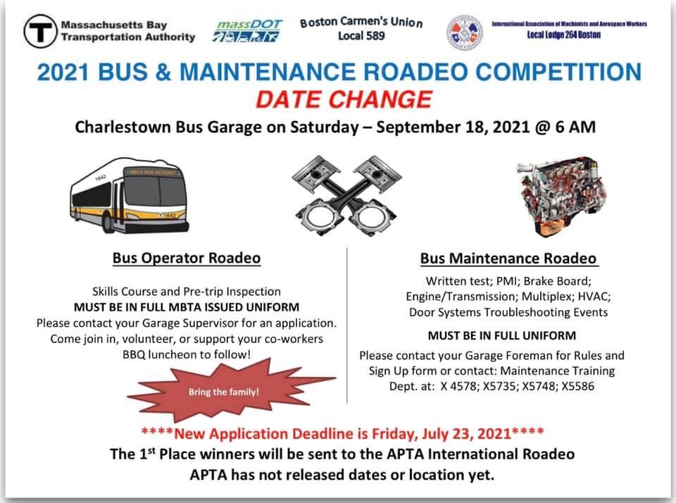The 2021 MBTA Bus & Maintenance Roadeo has been changed to Saturday, September 18th. New application deadline is next Friday, July 23. Active and retired members that would like to volunteer to help out on the course, please contact Justin Grizey at JGRIZEY@mbta.com or 617-222-5093.