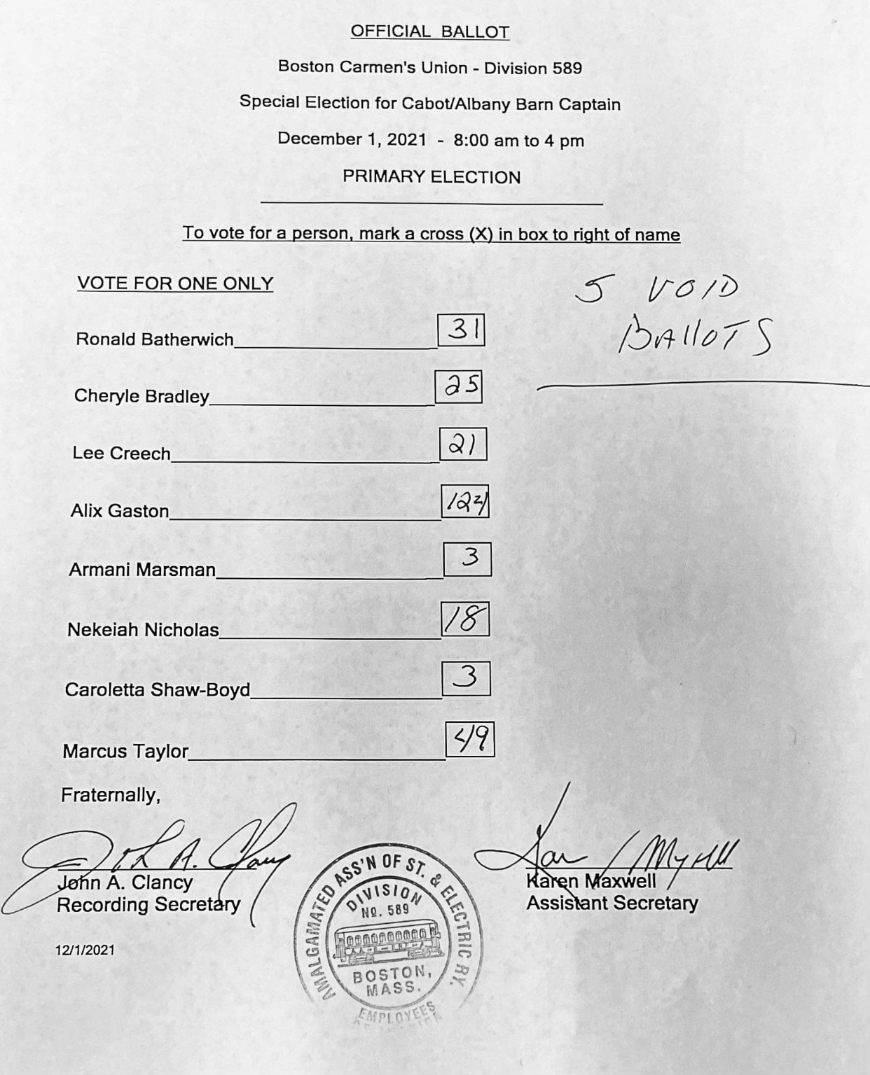 Good Evening Everyone, Below are the results from today’s preliminary election at the Cabot Bus Garage. Thank you to everyone who put themselves out there as a candidate and congratulations to Alix Gaston and Marcus Taylor, both of whom will be moving on to the final election next week. Polls will be open next Thursday, December…