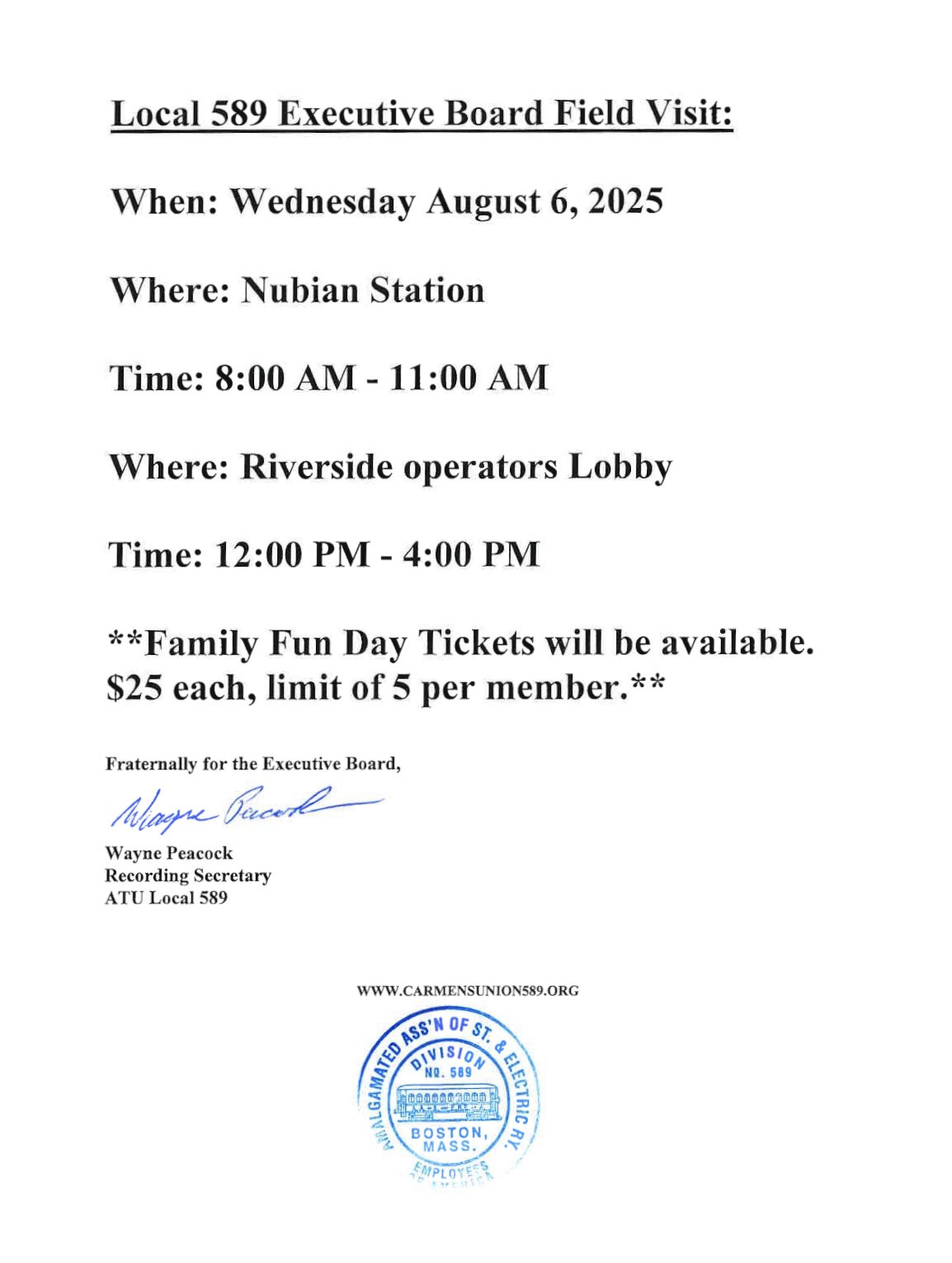 Join the Local 589 Executive Board for a field visit on Wednesday, August 6, from 8 to 11 a.m. at Nubian Square and 12 to 4 p.m. at Riverside Operator’s Lobby. We’ll be selling Family Fun Day tickets during the visit!