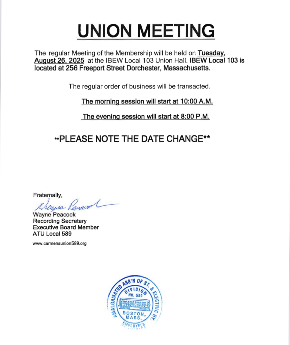 Don’t miss our next union meeting on Tuesday, August 26, at two convenient times: 10 a.m. and 8 p.m. at IBEW Local 103 in Dorchester.