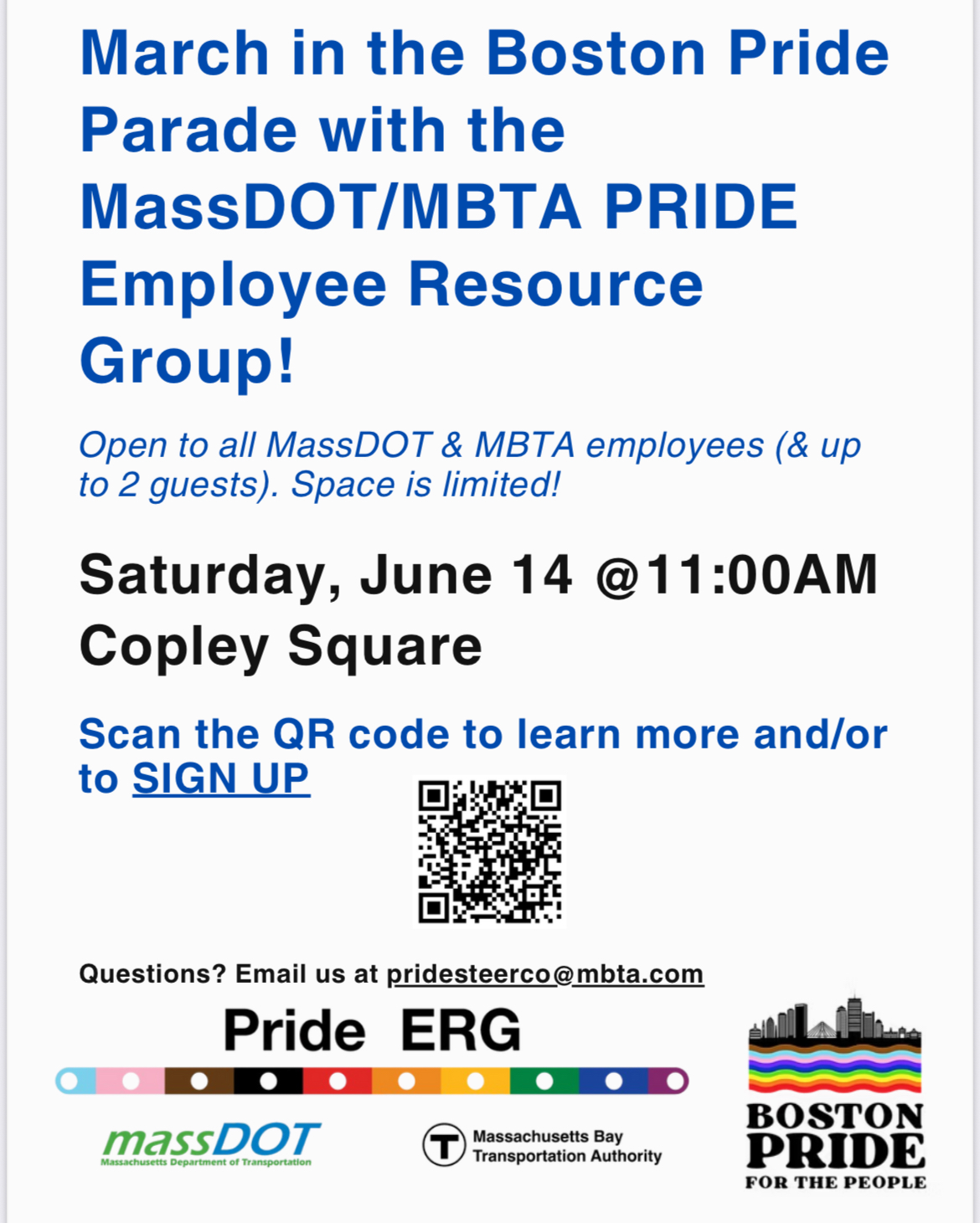 Local 589—come march in the Boston Pride Parade with the T! Join us June 14 at 11 AM in Copley Square. Space is limited—scan the QR code to sign up! Questions? Email pridesteerco@mbta.com. #Local589 #BostonPride #PrideWithTheT