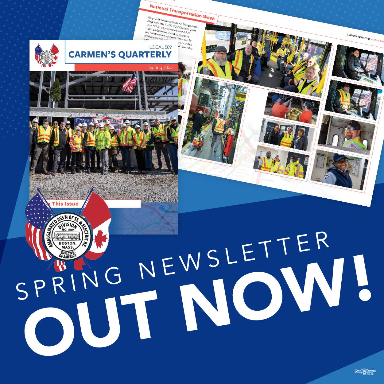 Look no further for the latest news and updates from Carmen’s Union Local 589! The spring edition of Carmen’s Quarterly features highlights from recent events, celebrates National Transportation Week, and shines a spotlight on our outstanding operators and maintenance technicians for their work during another successful Patriots Day across the city. Click the link below…