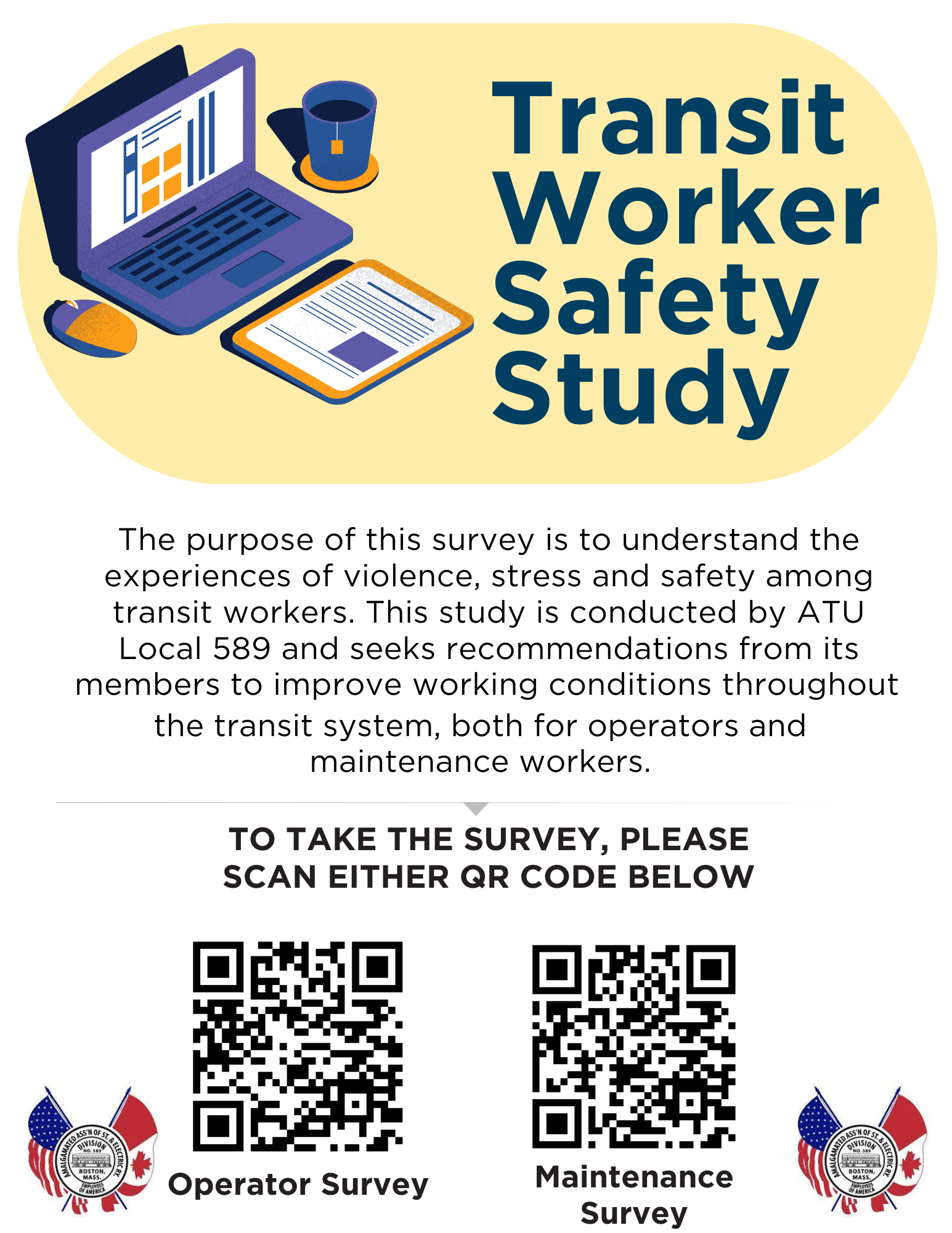 Dear Members, Student interns from the ATU International, in partnership with Local 589, have created a brief 5-7 minute survey to gather your suggestions for improving working conditions, addressing health hazards, and combating workplace violence. All responses are completely anonymous and will contribute to an upcoming report advocating for better conditions and resources. You can…