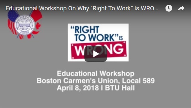 Earlier this month, Ben Gordon with the International ATU provided an educational workshop for our members on why “right to work”is WRONG. Click on the link below to watch his presentation as well as hear him answer questions from the membership after. Please share!