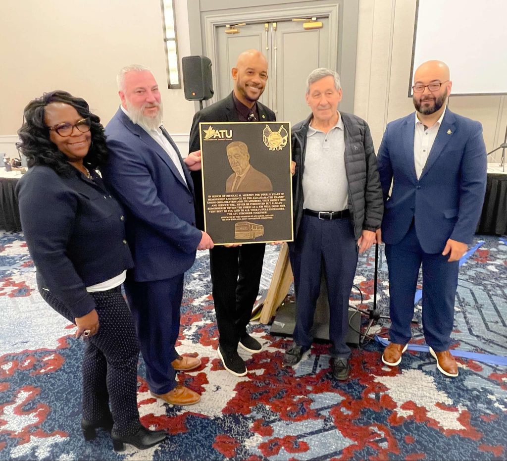 Today, at the New England Joint ATU Conference, retired ATU IVP Richard Murphy was presented with a plaque honoring his lifetime of service to improving workplaces for transit workers in Boston and across North America. A former president of Local 589 in the 1990s, Murphy began his career as a bus and streetcar operator. Congratulations, IVP Murphy, on your well-deserved retirement!