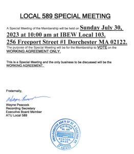 This morning, at a special meeting of the membership, the members in attendance unanimously voted to ratify an agreement with the MBTA. The Executive Board is very pleased with the contract and we appreciate the ongoing efforts of our members to Build a Better T. If anyone has questions regarding the terms of this agreement,…