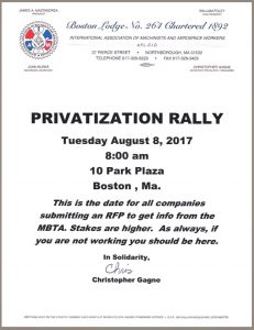 Please join our union brothers and sisters of IAM Local 264 Boston for a rally against privatization of the MBTA this Monday (7/31) @ 10:30 a.m. outside the Transportation Building (10 Park Plaza, Boston, MA). All Local 589 retirees and members (who are not working) should attend.