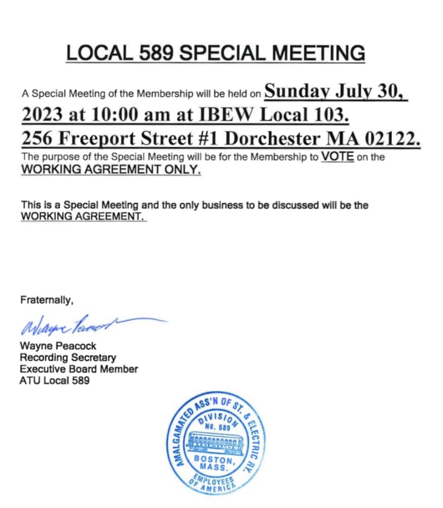 Special Meeting of the Membership on Sunday (7/30) at IBEW Local 103